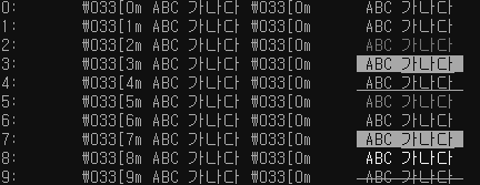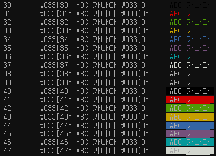 print('%s:\t \\033[%sm ABC 가나다 \\033[0m \t\033[%sm ABC 가나다 \033[0m' % (i, i, i))