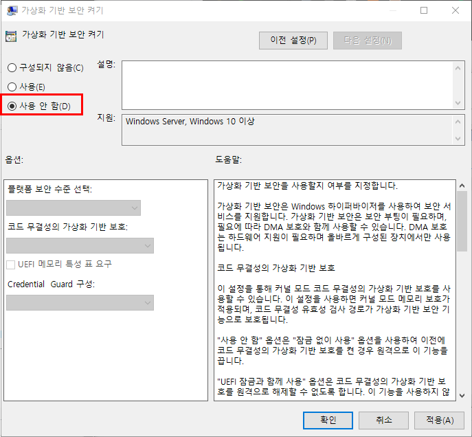 1. 가상화 기반 보안 켜기 - 사용 안 함 설정