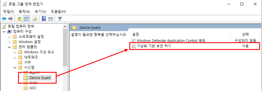 로컬 그룹 정책 편집기에서 "컴퓨터 구성 -> 관리 템플릿 -> 시스템 - Device Guard -> 가상화 기반 보안 켜기 편집(더블클릭)