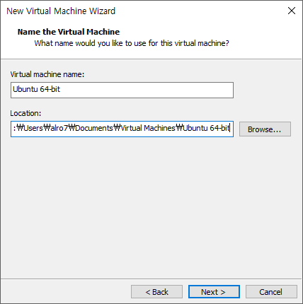 가상 머신 이름과 가상 머신이 저장될 경로를 선택합니다 -> Next